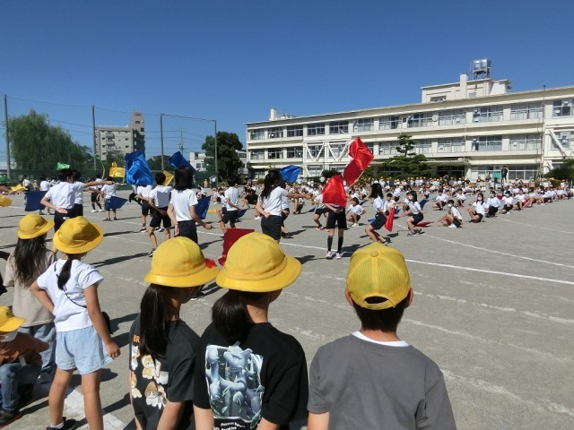 20分放課に、全校生徒に向けて6年生がフラッグの演技を発表しました。多くの下級生たちが応援に駆けつけ、6年生のかっこいい演技に大きな拍手を送っていました。
