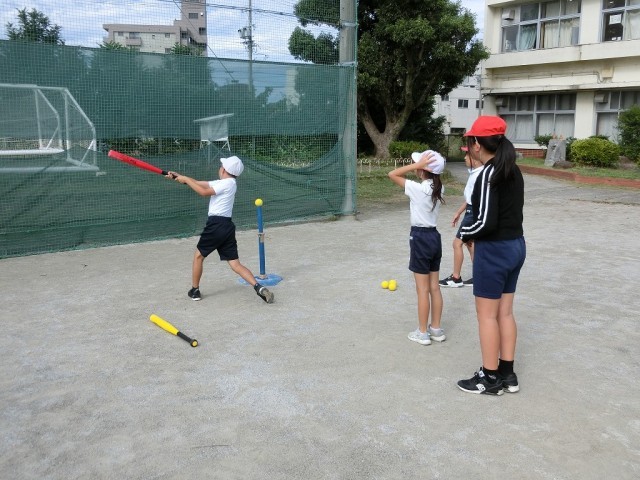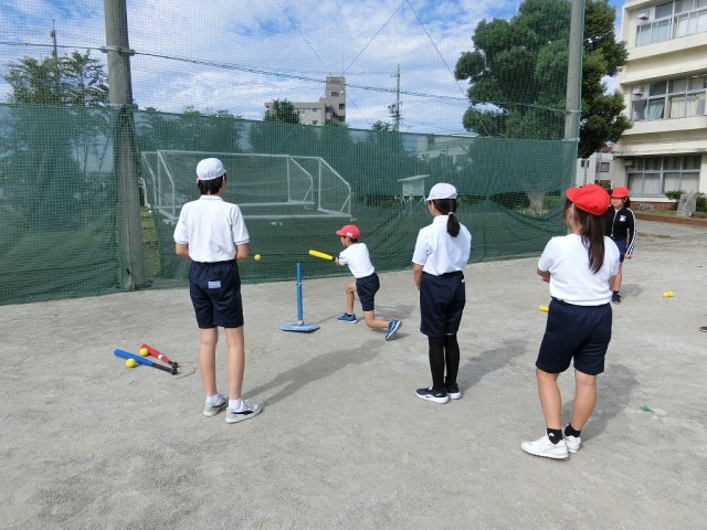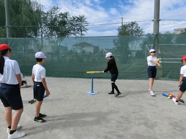 5年生の体育です。ティーボールのバッティング練習をしました。ティーの上にのせたボールを打つので、野球が苦手な児童も取り組みやすい種目です。