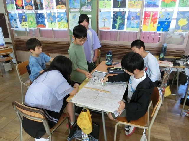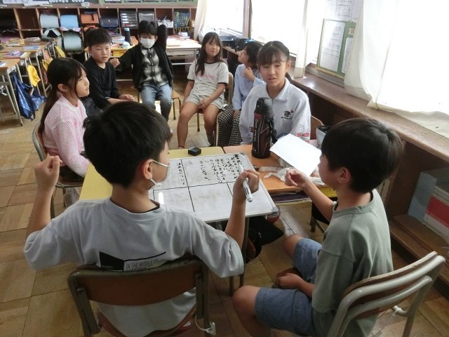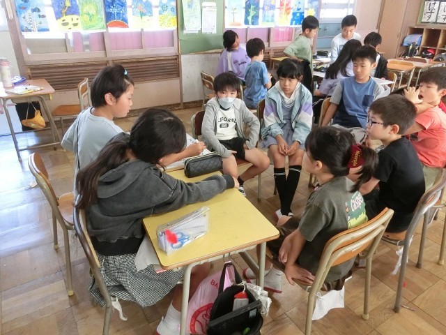 4年生の国語です。「学校をよくするために自分たちができること」というテーマで、班ごとに意見を出し合いました。司会や記録などの役割を決め、どのような手順で話し合い活動を行うとよいのかを意識していました。