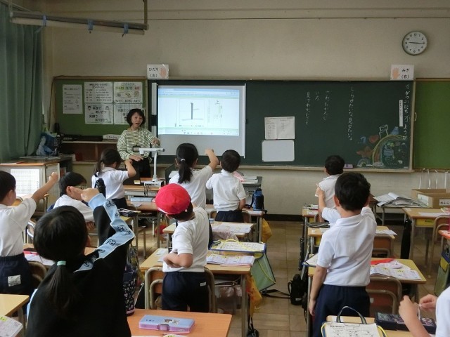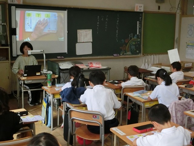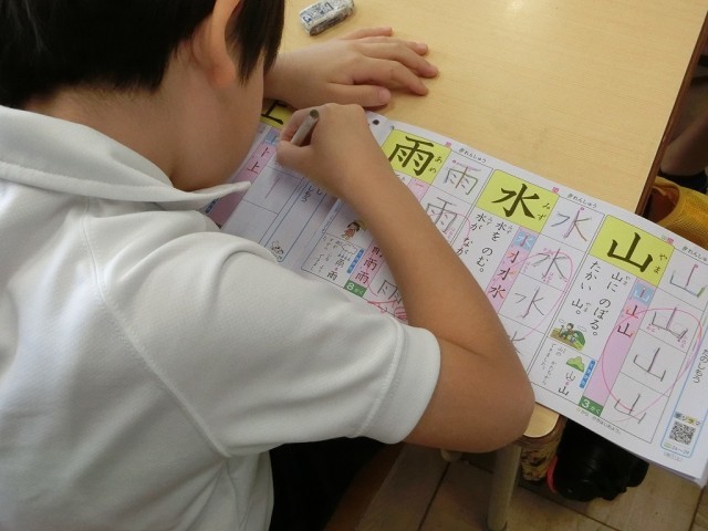 1年生の国語で、漢字練習をしました。手を動かして書き順を確認するときに「縦、横、横」など声に出して練習するとより覚えやすくなります。教室の外まで聞こえる大きな声と一緒に、全員で手を動かしていました。
