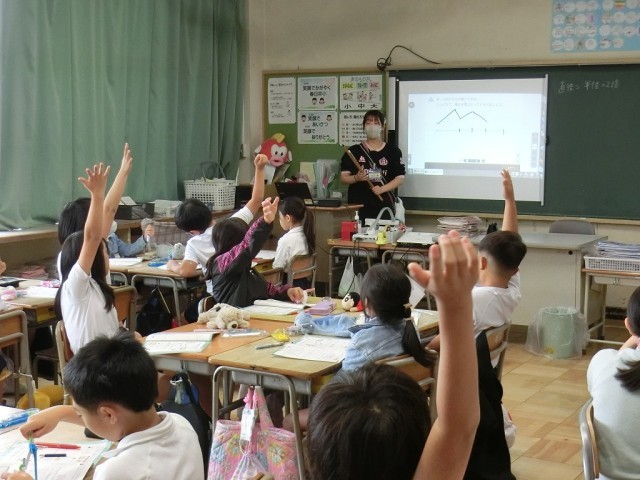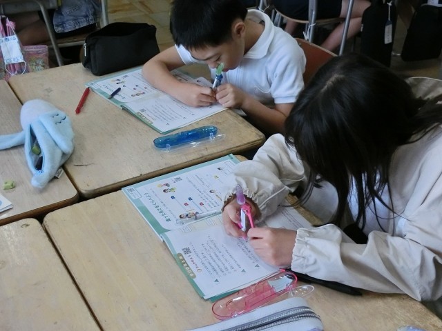 3年生の算数です。コンパスを使った長さ比べの練習問題に取り組みました。2日前にはできなかった問題ができるようになり、みんなうれしそうな顔をしていました。
