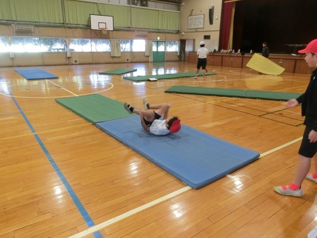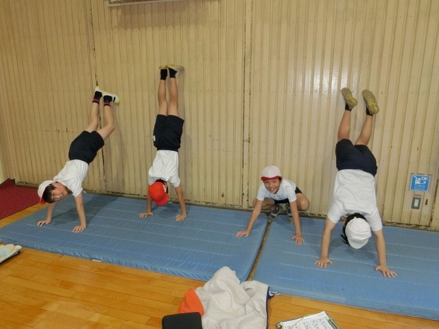 5年生の体育です。マット運動の練習をしました。倒立練習は壁を利用しました。また、教師が技の内容を確認しやすいように、放射線状にマットを並べて練習していました。