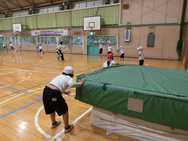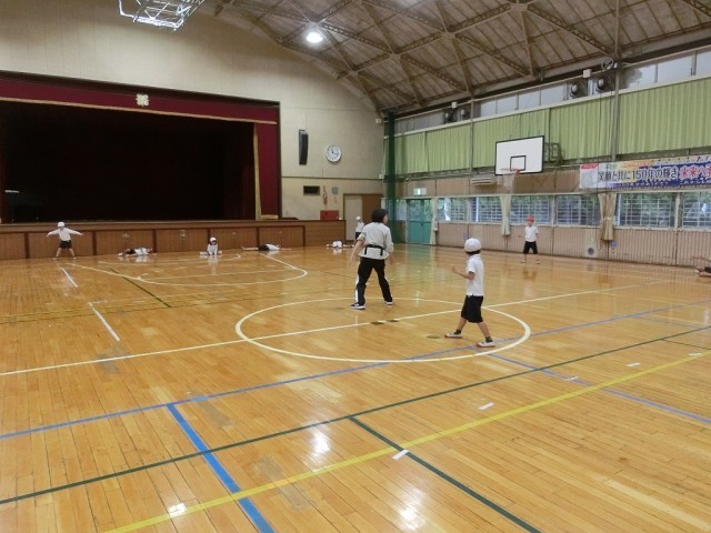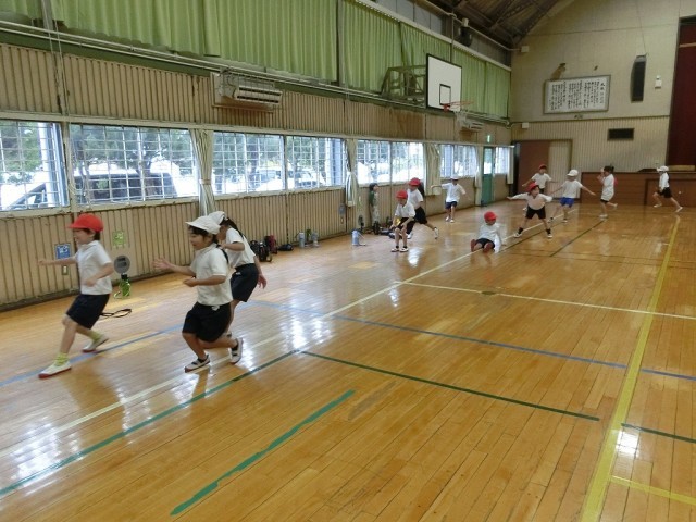 1年生の体育です。準備運動の一環で体育館内を走るときに、スキップや「だるまさんが転んだ」などを取り入れて活動していました。子どもたちはその時々の条件に合わせて、楽しそうにやっていました。