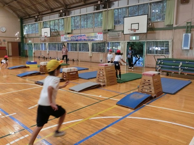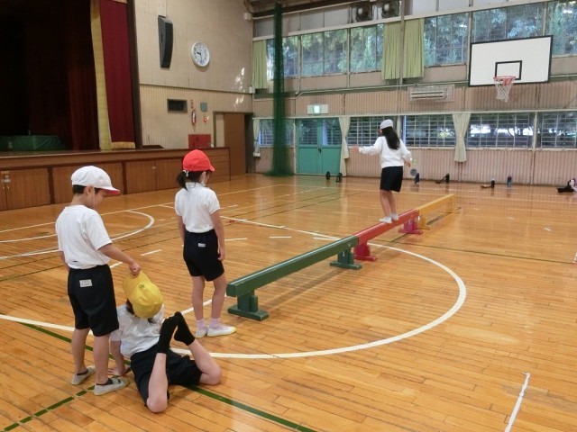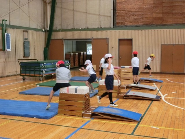 2年生の体育です。跳び箱と平均台の練習をしました。跳び箱はコースに分かれていて、自分でチャレンジする高さを選んでいました。