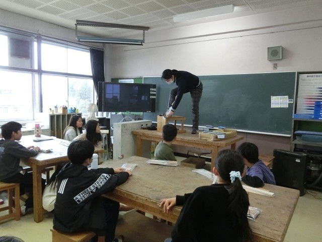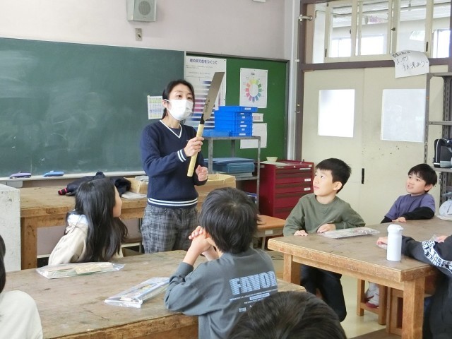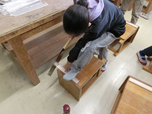 4年生の図工です。のこぎりの使い方を学びました。子どもたちも緊張した面持ちでしたが、先生の実演を見ながらやってみることで使い方に慣れていきました。