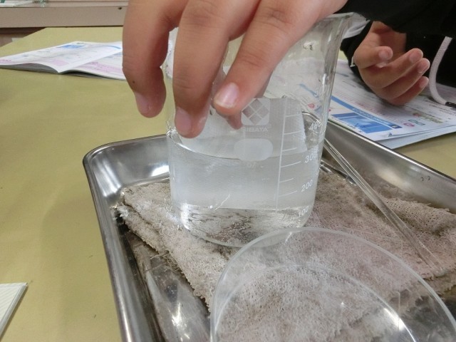 5年生の理科です。水溶液の実験で、食塩を水に溶かしました。食塩が入ったパックをビーカーに入れると下の方から食塩が溶け出す様子を目視することができ、子どもたちはその様子に釘付けでした。