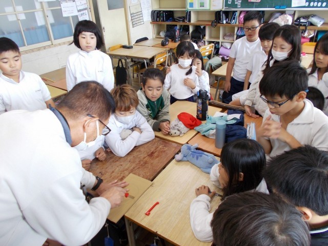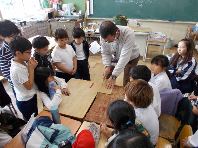 3年生 図画工作の授業では、ダンボールカッターを使用します。今日は、使い方を学びました。力を入れるのではなく、やさしく小刻みに手を動かすことで簡単に切ることができると学びました。先生の手本では「お~」という子どもたちの反応がありました。