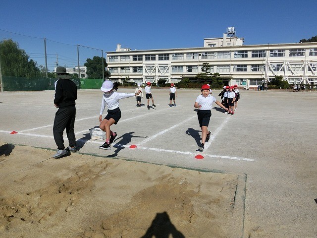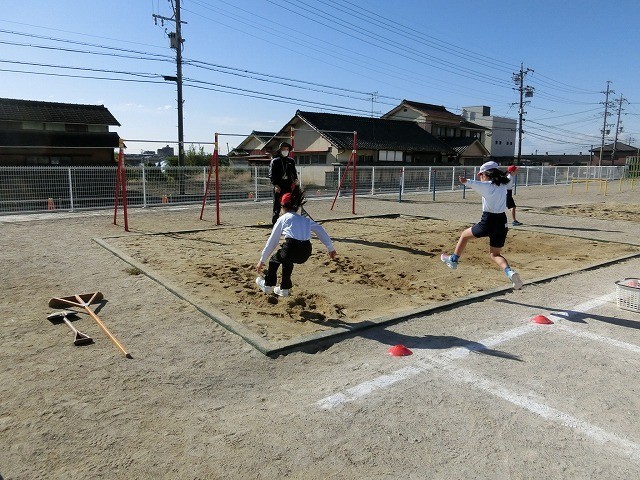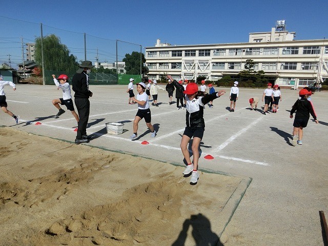 4年生の体育です。走り幅跳びの最後の授業で、記録会を行いました。自分の最高記録をプリントに記し、単元の振り返りを書いていました。