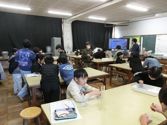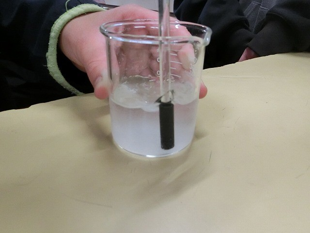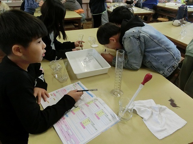 5年生の理科です。水溶液の単元で、今日は食塩とミョウバンの2種類を、それぞれスプーンに何杯溶けるかの実験をしました。同じような材料に見えますが、溶ける量に違いがあることを実験の様子から掴んでいました。