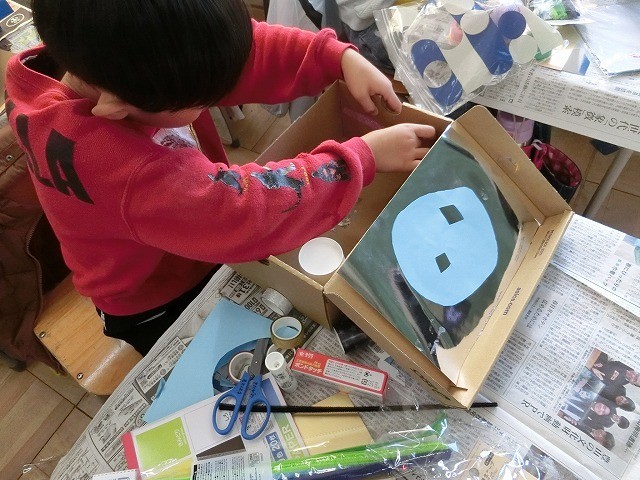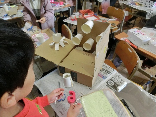1年生の図工です。箱を様々な材料で飾り、自分だけの宝箱をつくりました。家からもってきた材料を思い思いに加工し、素敵な宝箱を目指しました。