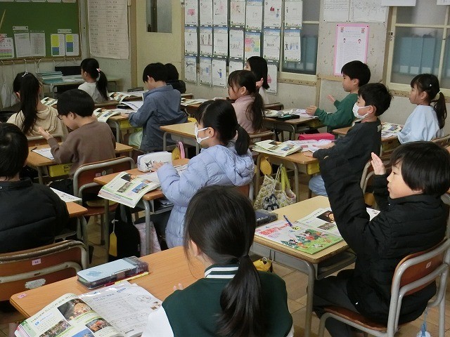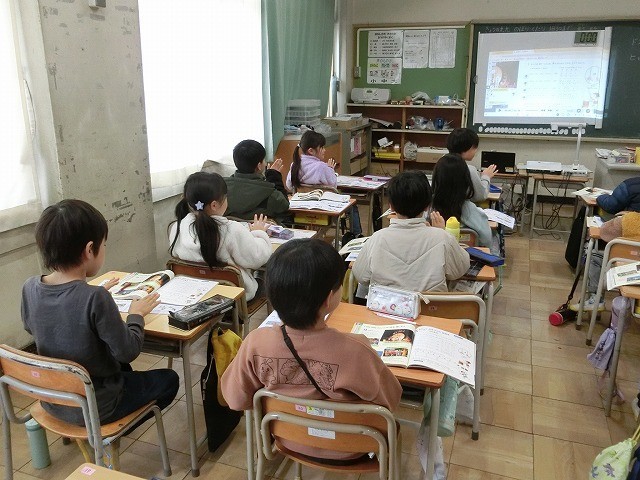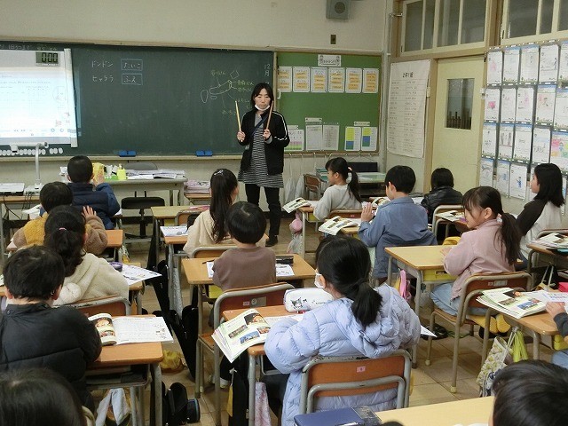2年生の音楽です。太鼓のリズム練習をしました。先生が示したリズムに合わせて手で机をたたき、音を合わせていました。