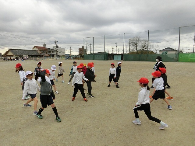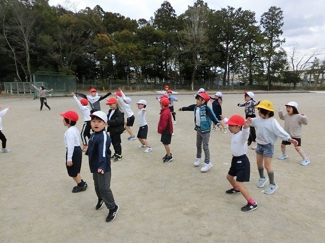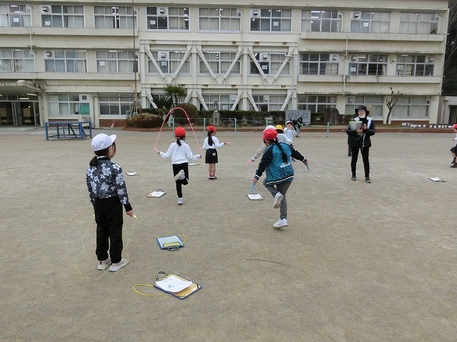 1年生の体育です。今日は寒い日でしたが、子どもたちは元気よく準備体操に取り組みました。その後、ペアを組んで縄跳びの練習を行い、これからのテストに備えました。