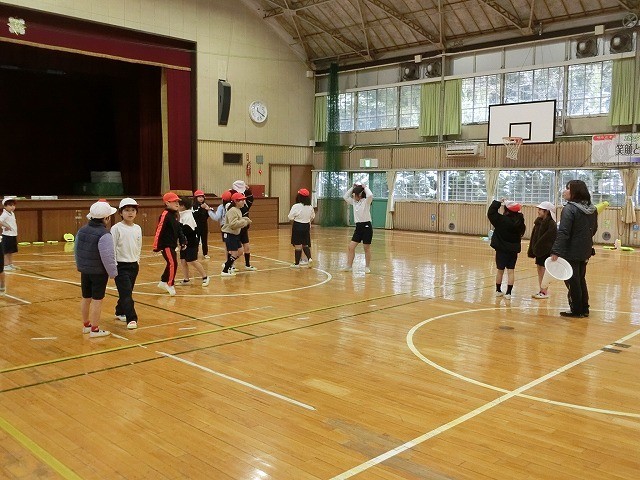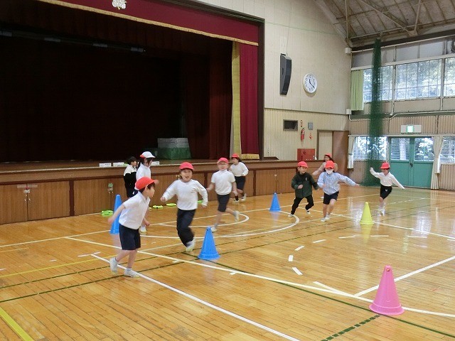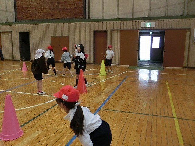 2年生の体育です。準備運動で、鬼ごっこをやって体を温めました。写真に写っているコーンは、「テニピン」の目印です。またの機会に紹介します。