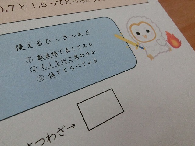 3年生の算数です。少数の問題ですが、その理屈を「ひっさつわざ」を使って低学年にもわかりやすく説明できないかにチャレンジしました。具体的な相手をイメージすることで、やる気がぐんと上がりました。