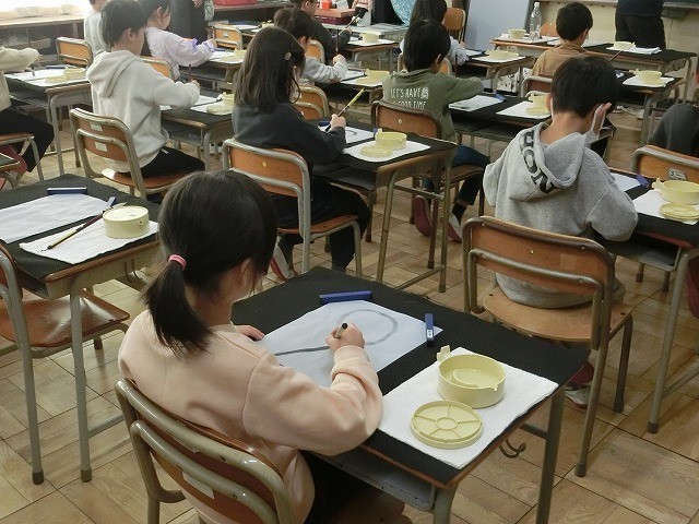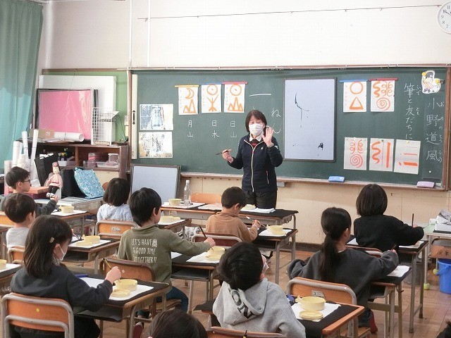 1年生の書写です。今日は講師の先生に水習字を指導していただきました。墨ではないので、子どもたちも安心して取り組むことができました。初めて筆に触れる児童も多く、簡単な図形などを書きながら筆の感触を味わいました。