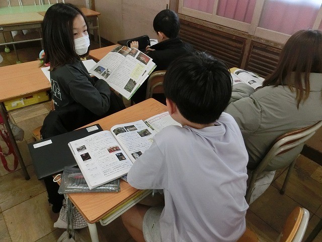 4年生の社会です。足助地区についての情報を教科書で調べました。情報の中身を「時間、空間、人」などの視点で分類して教科書に線を引いていました。この後、Xチャートに情報を抜き出して整理する予定です。