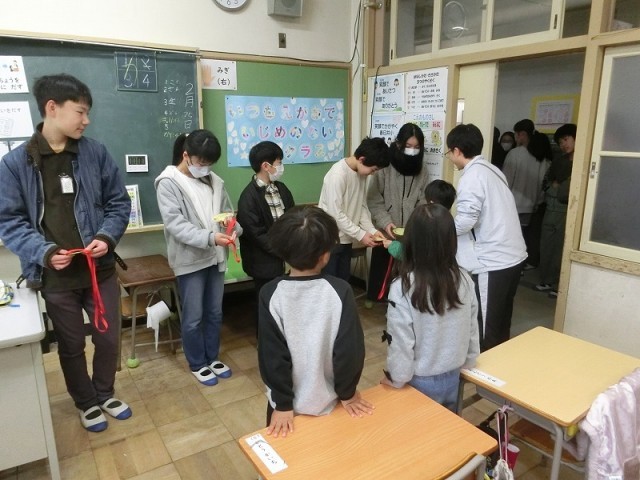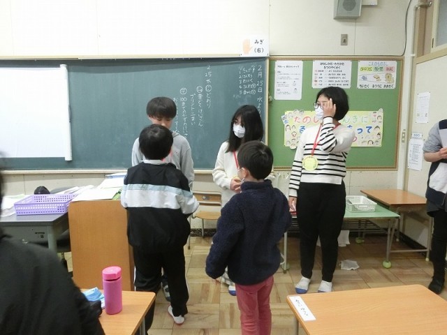 先日のインフルエンザ流行のため延期になっていた6年生へのペンダント渡しを本日、行いました。このペンダントはなかよし班の1~5年生が手分けしてつくったもので、1年生が代表して6年生に渡しました。27日の6年生を送る会で改めて6年生の皆さんが身に付けて会に臨んでくれます。