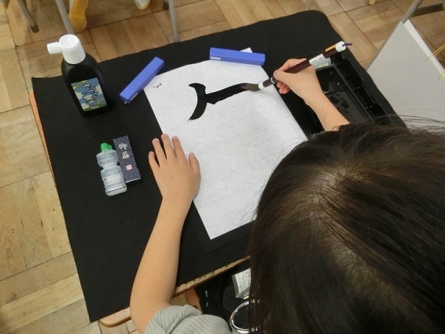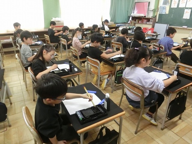 2年生の書写です。昨日に続いて、別のクラスで指導いただきました。どの児童も仕上げの「午」の字を書くときには、とても真剣な表情で取り組んでいました。