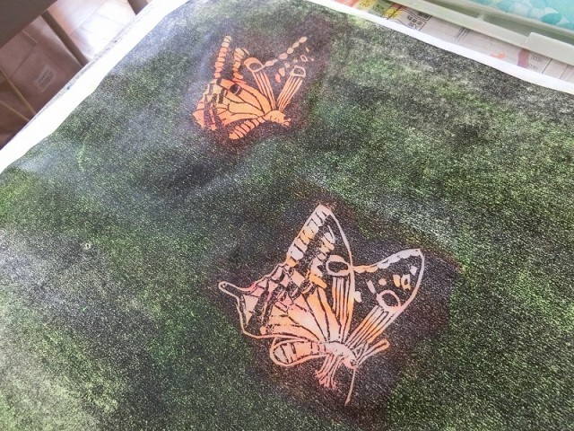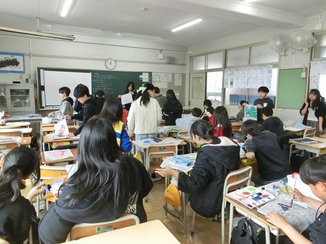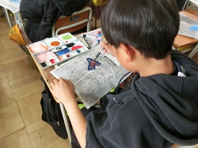 6年生の色版画の様子です。黒インクで印刷したものの裏側から、絵の具で色を付けていきます。そうすると、表から見ると白い部分だけが彩色されたようにきれいに見えます。真ん中の蝶の作品はすごく細かい作業でつくったようです。思わず驚いてしまいました。
