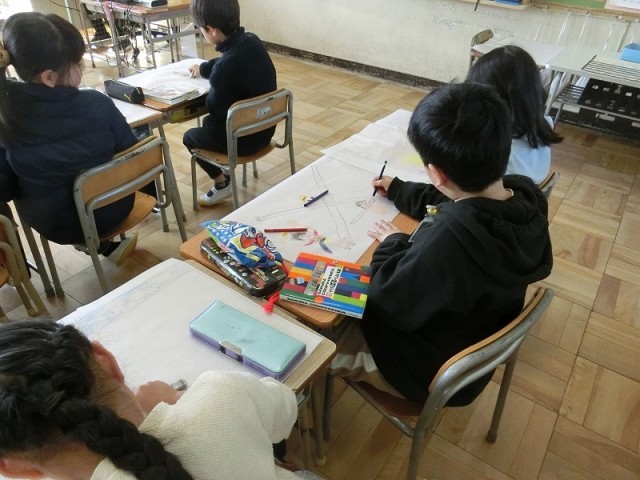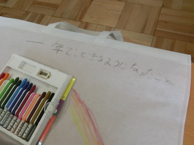 2年生の図工です。この1年間で制作した図工作品を持ち帰るための大きな手提げ袋に、思い出の絵を描きました。