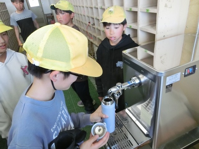 6年生のお楽しみ会の途中、気温が随分と上がってきました。協議の後で喉が渇いた児童がたくさんいたので、急遽、ウォーターサーバーを稼働させました。このサーバーはPTAのご協力をいただき、150周年行事予算から支出しました。冷水を汲むサーバーのため、手持ちの水筒を利用します。忘れてしまった場合に備え少量のコップを用意していますが、基本はご家庭から水筒をご持参ください。