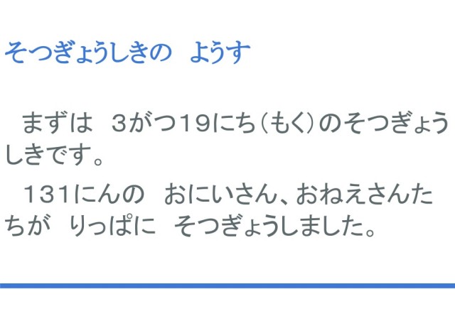 まずは、先週19日木曜日の卒業式についてです。校長先生から、131名の6年生に卒業証書を手渡しました。6年生のお兄さん、お姉さんは緊張しながらも卒業証書を受け取り、立派に卒業していきました。(注:このあと、児童たちには写真を見せました)
