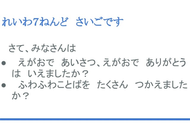 さて、みなさんは「笑顔であいさつ 笑顔でありがとう」は言えましたか?「ふわふわことば」をたくさん使えましたか?1回できた人は次は2回、2回できた人は次は3回とたくさん使えるといいですね。
