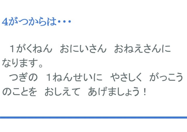 4月になると、みなさんは1学年お兄さん、お姉さんになります。新しく入学してくる1年生は小学校のことを不安に思っているかもしれません。優しく教えてあげてください。