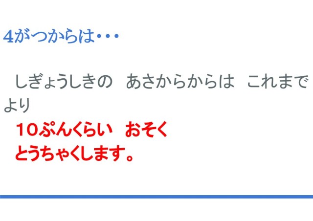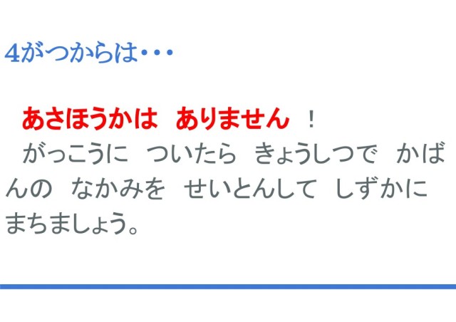 次に皆さんとお会いするのは、5年生は4月7日、1~4年生は4月9日です。4月9日の始業式の朝からはこれまでより、通学班の集合や出発が10分くらい遅くなります。また、朝放課はありませんので、学校に来たら、教室で鞄の中身を整頓して静かに待ちましょう。