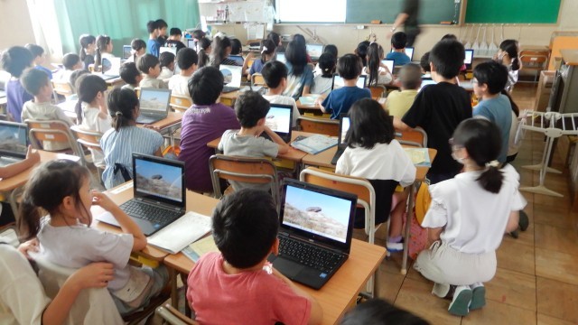 この日が初めての交流の日だったため、1年生と6年生で挨拶をしてから始めました。6年生は1年生に対して、クロームブックの電源の入れ方やカメラ機能の使い方を優しく教えていました。1年生の「ありがとう」や「笑顔」に6年生もとても嬉しそうでした。