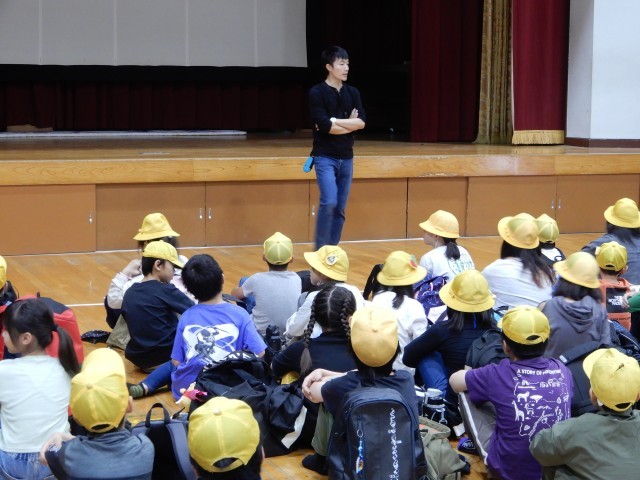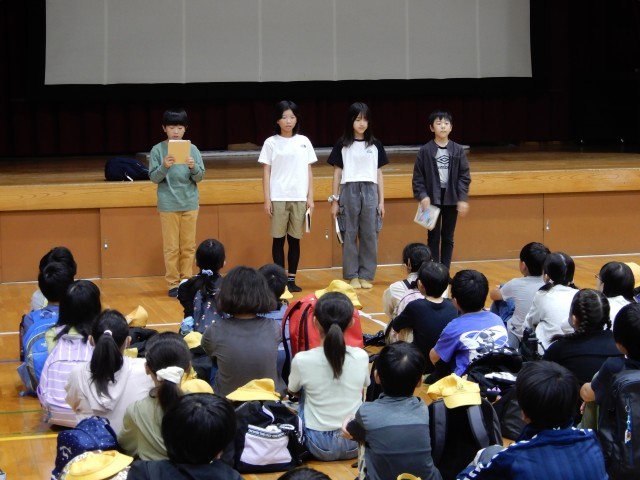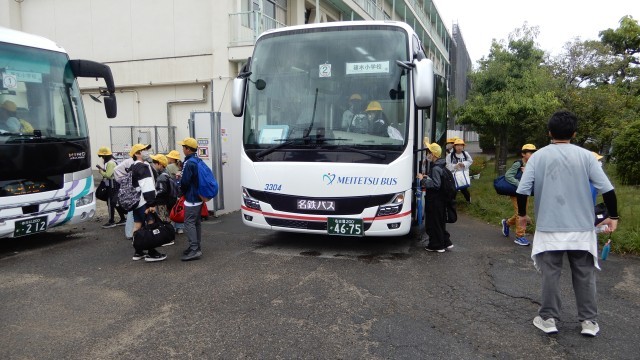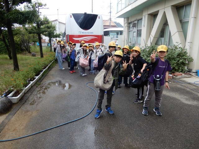 小雨降る中、5年生が笑顔いっぱいで野外学習に出発しました。感染症も流行りつつある世の中ですが、出席予定だった子たちは無事全員参加することができました。