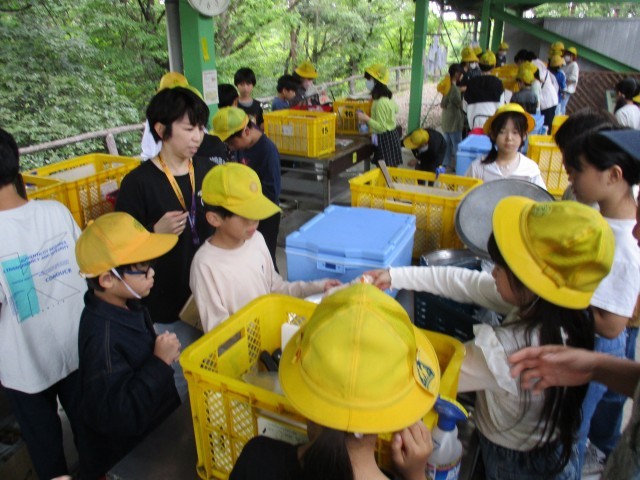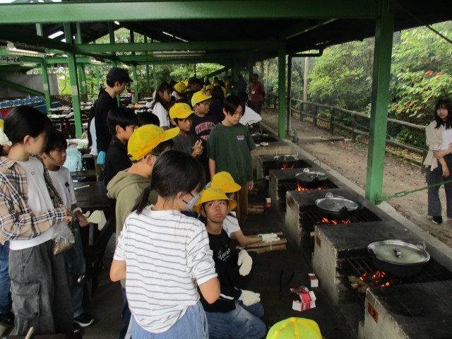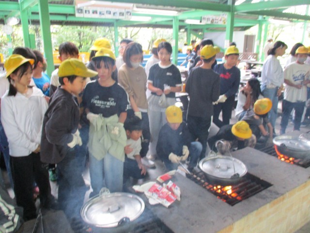 野外炊飯にて、自分たちで木を組んで火を準備しました。