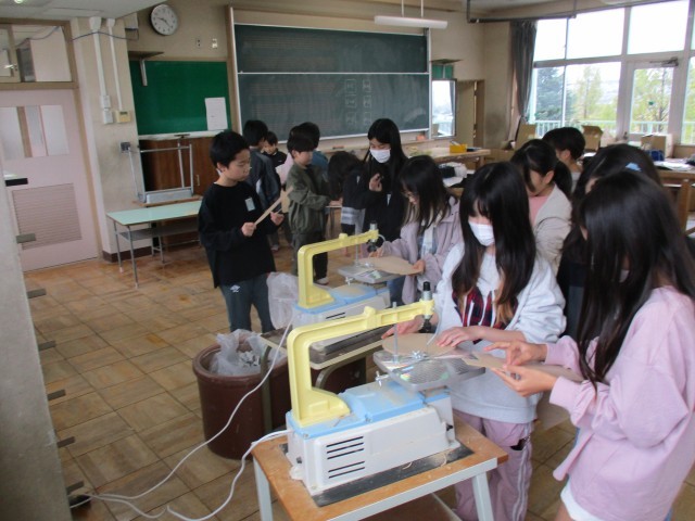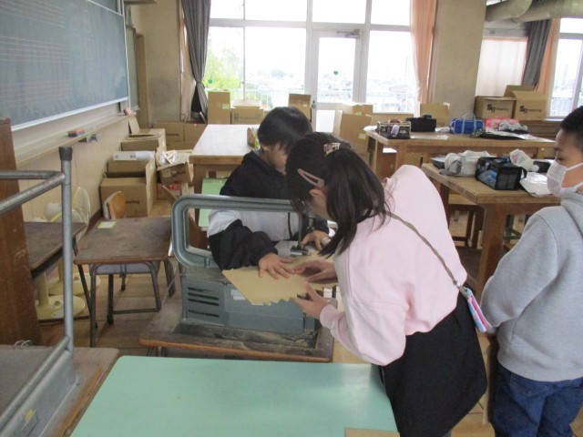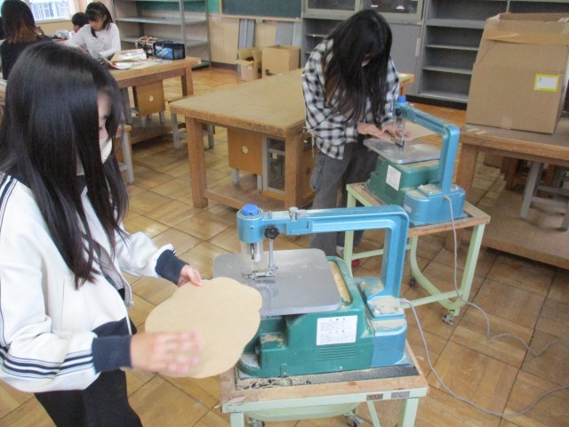 図工では、電動糸のこぎりをつかって、木を切りながら作品作りに取り組んでいます。最初は初めて使う道具だったので、緊張していましたが、慣れてきて上手に木を切ることができるようになってきました。あとは色を塗り、作品を完成させていきます。個性あふれる、素敵な作品ができるのが楽しみです。