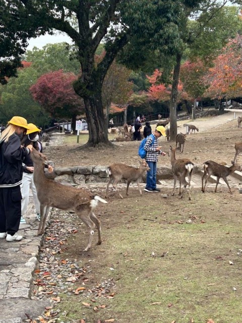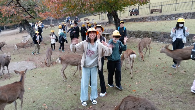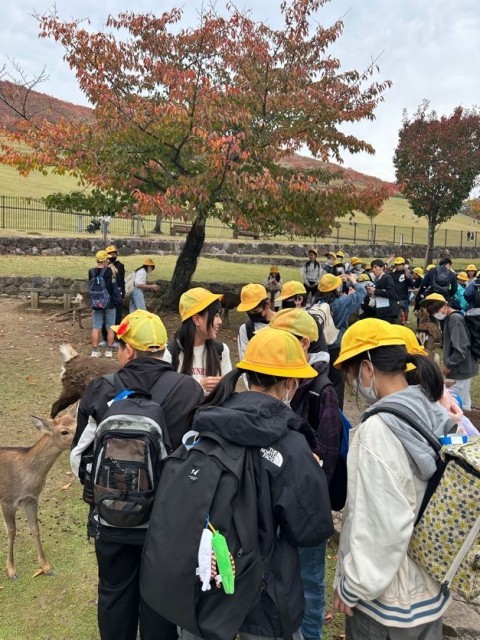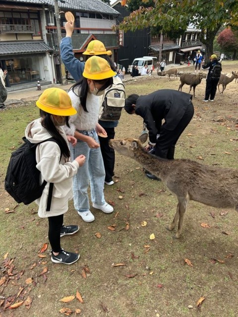 若草山にて鹿と戯れています。このような広大な土地に数多の鹿が解き放たれている景色に、子どもたちはとても驚いていました。最初は怖がっていた子も徐々に慣れてきて、楽しそうに鹿せんべいを差し出していました。