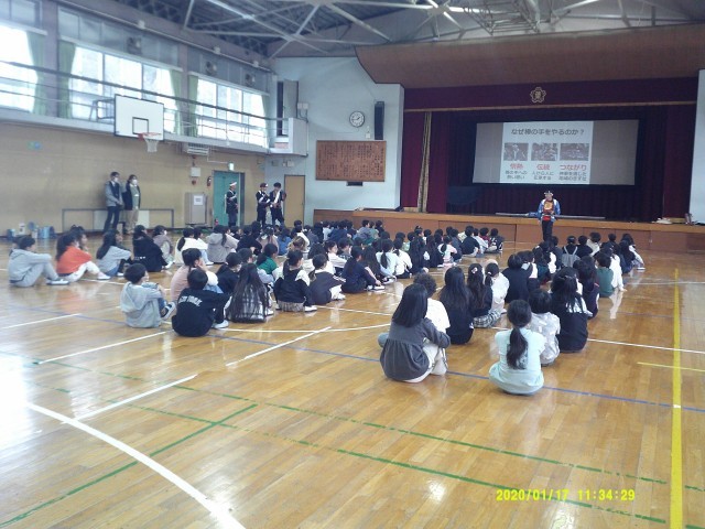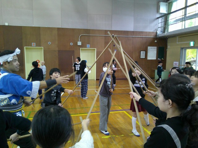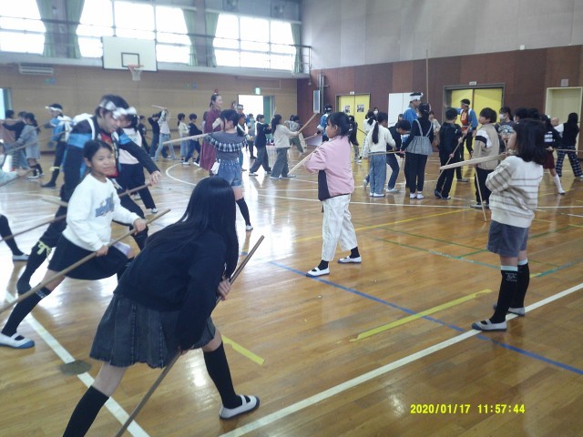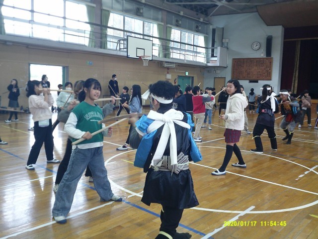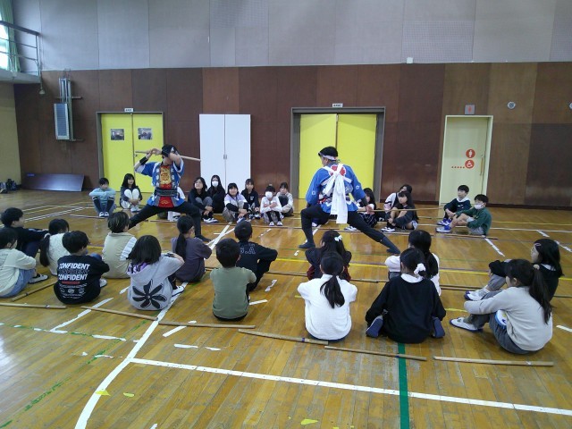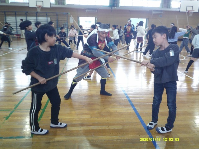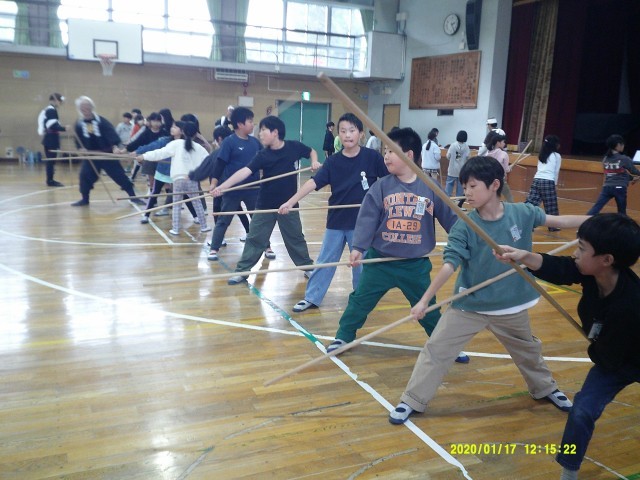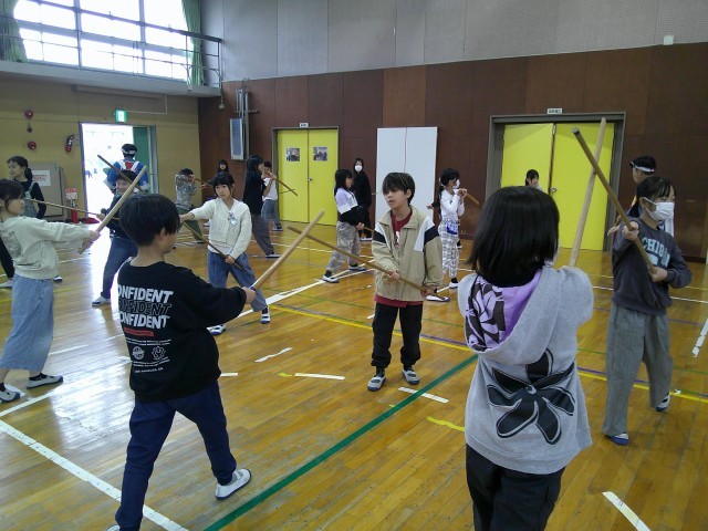 棒の手保存会(大留・小木田・出川)の方々をお迎えして、棒の手の出前授業が行われました。はじめに、棒の手という伝統芸能についての説明を聞きました。その後、3つのグループに分かれてそれぞれの保存会の方の指導を受けながら棒の手の体験をしました。最後に、それぞれの保存会の演技を見せていただきました。