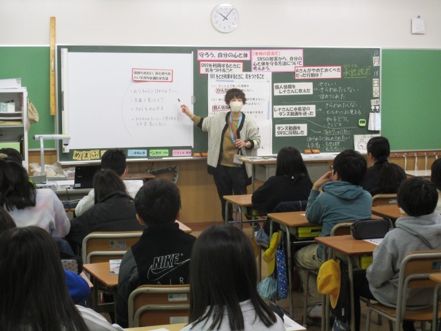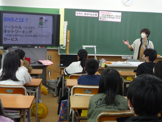 養護教諭から命の学習として、今日はSNSから自分の命を守るためにどうすればいいのかを教えてもらいました。今日学んだことを忘れずに、自分たちが使っているスマホやSNSでのトラブルから自分を守るために、これからも正しい使い方を学校でも学んでいきます。