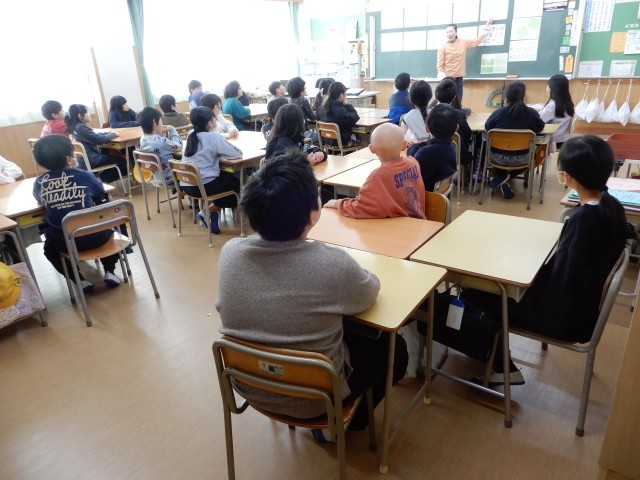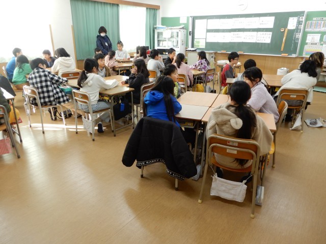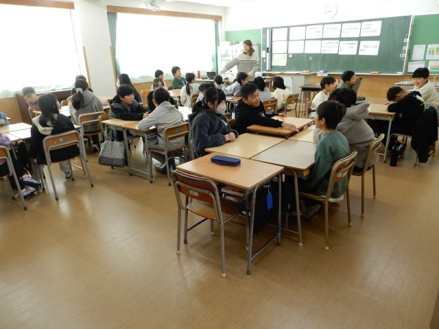 今日は「アドジャン」を行いました。出した指の本数の合計によって、お題が決まります。写真は4年生の様子です。