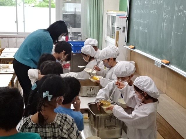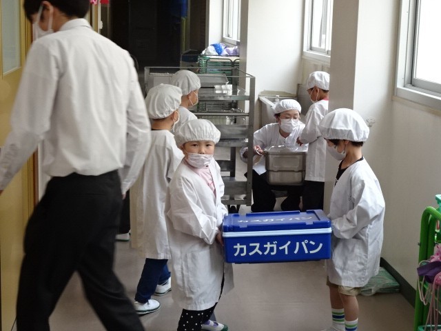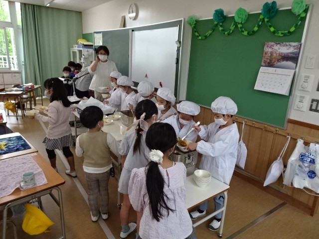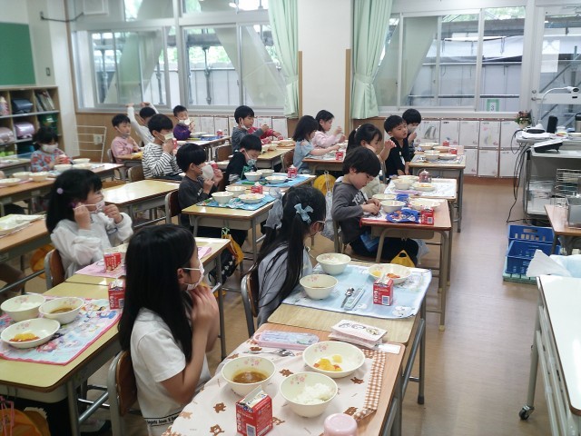 4/21(火)、1年生の給食がはじまりました。給食当番のみんなが協力して、給食の準備をしてくれました。今日のメニューは、「ごはん・牛乳・えがおのカレーシチュー・甘夏みかんのゼリー和え」でした。たくさん食べれたかな?