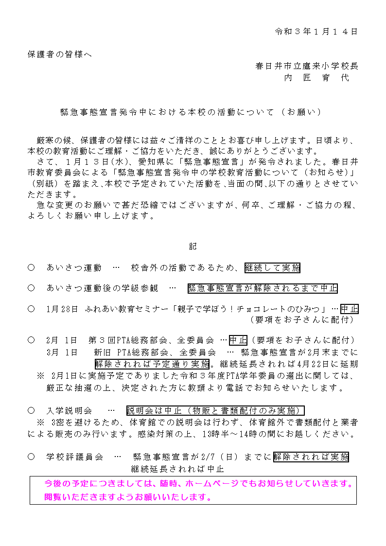 昨日、政府より愛知県に対して発令された緊急事態宣言を受けて、教育委員会からのお知らせと現段階での「変更」「お願い」等を掲載した文書を本日(1月14日)配付させていただきました。