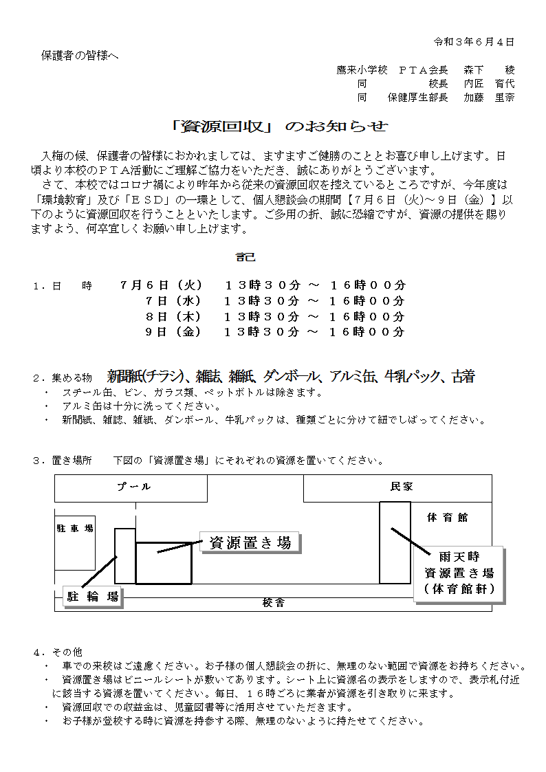 鷹来小学校では、長年にわたり、PTA主催で地域の方にもご協力いただき資源回収を行ってきましたが、今年度からは「環境教育」と「ESD」の一環として新たな方式による資源回収を行うこととしました。本日文書を配付しました。ご確認ください。