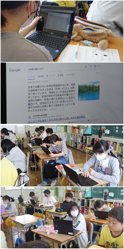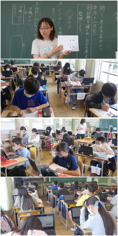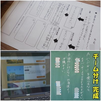 討論会のチーム分けをします。それぞれの主張についてタブレット端末を使って調べてから決めました。