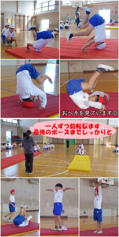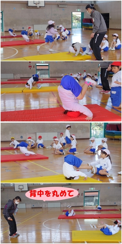 マット運動をしています。今日は前転です。全員、一人で転がることができました!