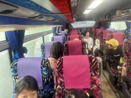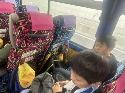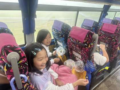 もうすぐ到着です。バスの中では、授業で習った内容を確認しながら楽しく過ごしています。