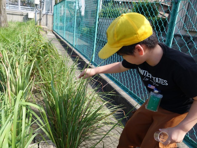 3年2組は、理科の時間に外に出て昆虫を捕まえました。小さなバッタは、とてもすばしっこくて捕まえるのにとても苦戦していましたが、何匹か捕まえることができて観察しました。