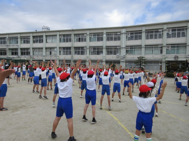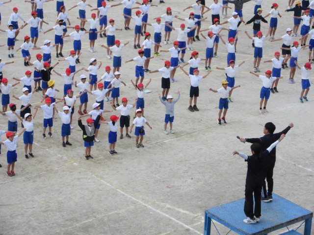 1時間目の前に全校児童でスポーツフェスティバルの全体練習を行いました。