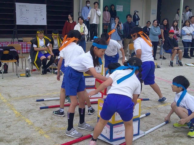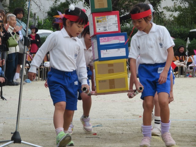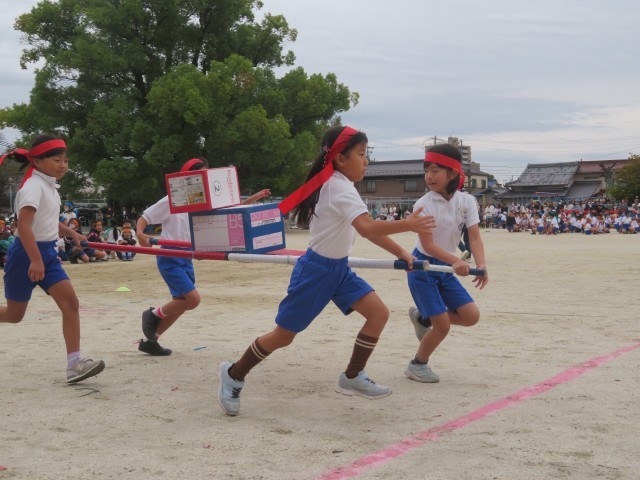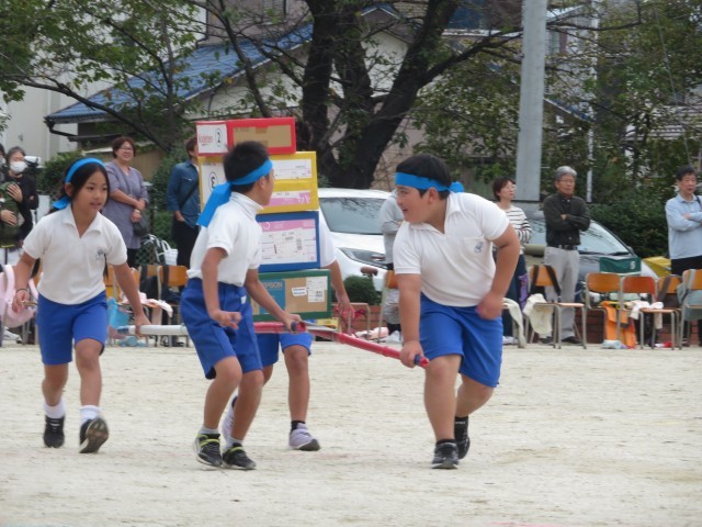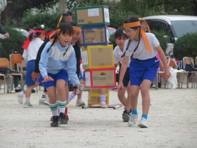 「宅急便リレー ~救え!物流業界!~」は3・4年生の競遊です。チームリレーで荷物を運ぶ競争です。走力だけでなく、チームワークも大切な競技でとても楽しい競争でした。