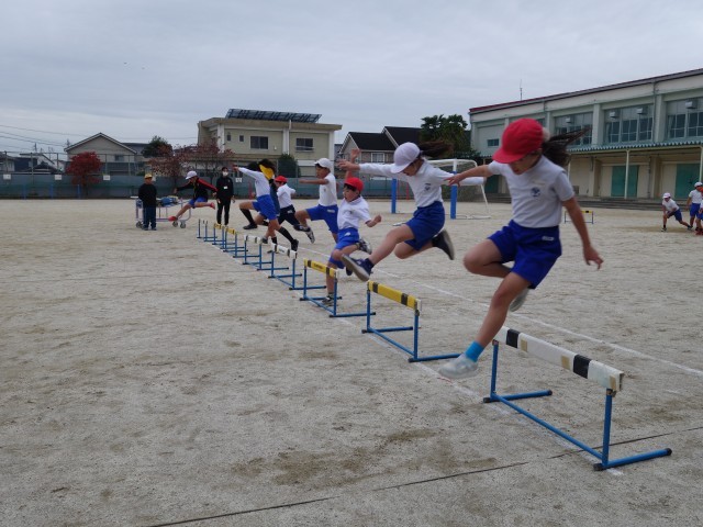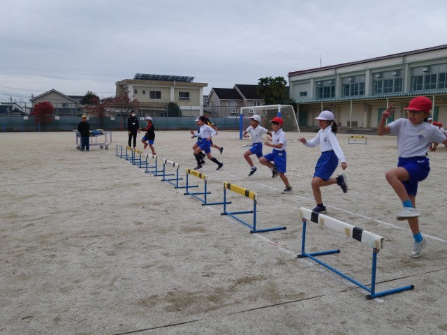 4年生は体育の時間にハードル走をしました。リズミカルにまたぎ越していくコツをつかむために何度も繰り返し練習をしました。