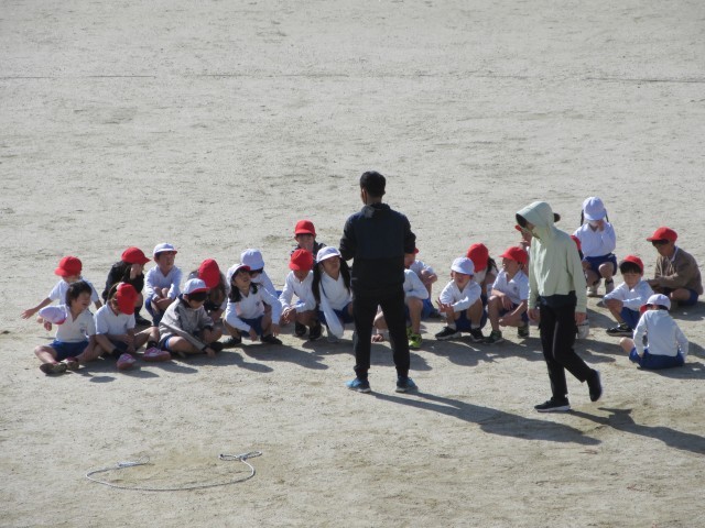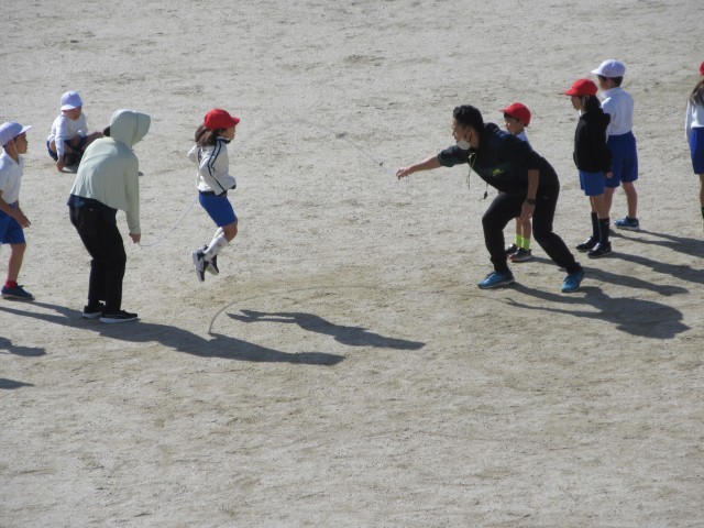 最初は縄に入るタイミングを掴むのが難しく、戸惑う姿も見られましたが、子どもたちは精一杯挑戦。「せーの!」と声をかけ合い、一生懸命に跳びます。失敗しても、みんなで「頑張れー!」と温かいエールを送り合う声が響きました。