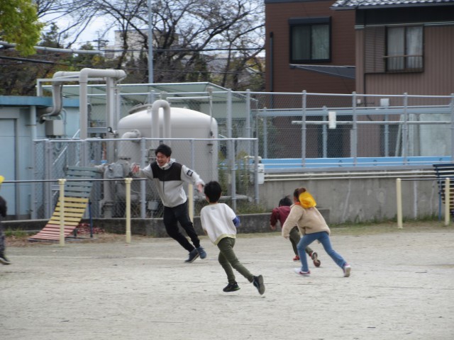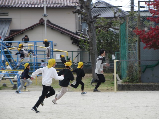 今日は若い先生も仲間入り!みんなが追いかける白熱した鬼ごっこに、校庭いっぱいに笑顔の花が咲きました。汗を流すのは体だけではありません。追いかけっこを通して、判断力や思いやりの心も育まれています。
