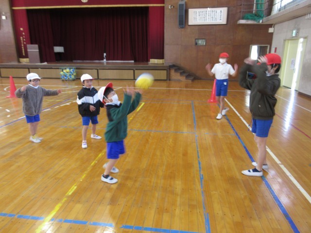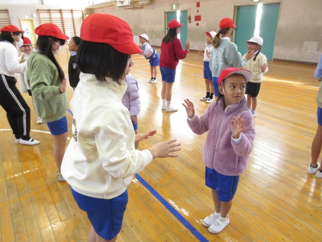 ペアになって手をつなぎ、息を合わせてジャンプ!キャッチボールでは、5年生の優しいパスに1年生も大張り切りでした。